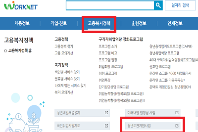 신청방법은 온라인과 오프라인 두 가지 방법이 있습니다, 온라인은 워크넷을 접속하신 후 아래와 같이 고용복지 카테고리에서 청년도전지원사업에 신청하시면 되면 오프라인은 가까운 고용복지플러스 센터나 기타 운영기관에 신청하시면 됩니다.