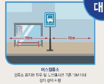 버스여객자동차의 정류지임을 표시하는 기둥이나 판 또는 선이 설치된 곳으로부터 10미터 이내의 곳. 다만, 그 버스여객자동차의 운전자가 그 버스여객자동차의 운행시간 중에 운행노선에 따르는 정류장에서 승객을 태우거나 내리기 위하여 차를 정차 또는 주차시키는 때에는 그러하지 아니하다.