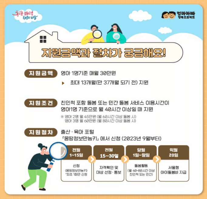 서울형 아이돌봄’에 관한 자세한 지원조건 및 절차는 9월 오픈 예정인“출산에서 육아까지” <몽땅정보 만능키> 누리집을 통해 확인할 수 있으며, 매월 1일부터 15일까지 부모 등 양육자가 <몽땅정보 만능키>를통해 신청 가능하다.