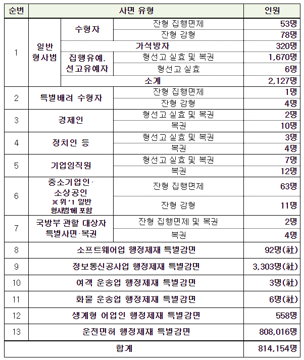 정부는 2023년 광복절을 맞이하여, 2023. 8. 15.자로 중소기업인·소상공인 등 서민생계형 형사범, 특별배려 수형자, 경제인, 정치인, 기업임직원 등 2,176명에 대한 특별사면을 단행함 이와 더불어 소프트웨어업, 정보통신공사업, 여객·화물 운송업, 생계형 어업인, 운전면허 등 행정제재 대상자 총 811,978명에 대한 특별감면 조치를 함께 시행하고, 아울러 모범수 821명을 가석방하여 조기 사회복귀를 도모하기위함이라고 밝혔습니다.