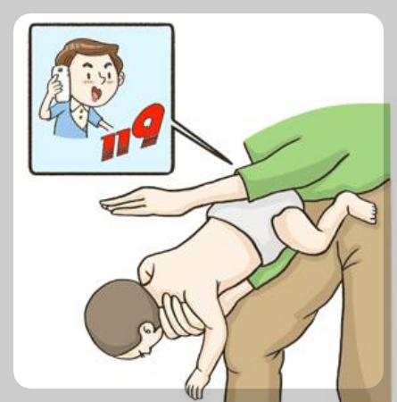 (소아) 1세 이하 혹은 체중 10kg 이하 소아는 머리가 아래를 향하도록 허벅지 위에 엎드려 눕힌 후 손바닥 밑부분으로 등의 중앙부를세게 두드리는 ‘등 압박’과, 양쪽 젖꼭지를 잇는 선의 중앙 부위 약간 아래를 두 손가락으로 4cm 정도 깊이로 강하고 빠르게 눌러주는 ‘가슴 압박’을 반복한다.