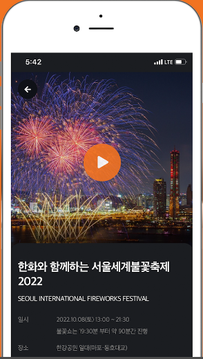 여의도 불꽃축제 유튜브외에 오렌지플레이 앱은 불꽃쇼에서 모든 불꽃이 스토리와 음악을 함께 머금고 있기 때문에 꼭 음악과 함께 불꽃을 관람해야 감동과 기쁨이 배가 된다고 합니다. 하지만 행사장 주변 외에는 스피커 등 음향시설이 설치가 되어 있지 않아 먼 거리에서 관람하시는 분들은 눈으로만 불꽃쇼를 즐겨왔었습니다. 오렌지플레이 해당 앱 서비스는 음악이 잘 들리지 않는 먼 거리나 또는 실내에서 불꽃쇼를 보시는 분들에게 축제를 즐길 수 있도록 서비스하고 있으며 불꽃축제 전용앱입니다.