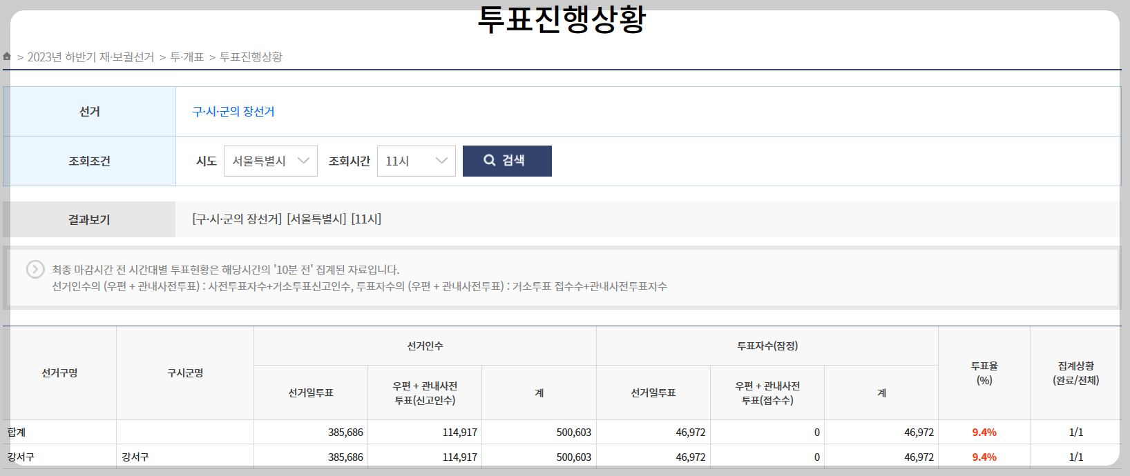 강서구청장 투표율11시경 9.4%