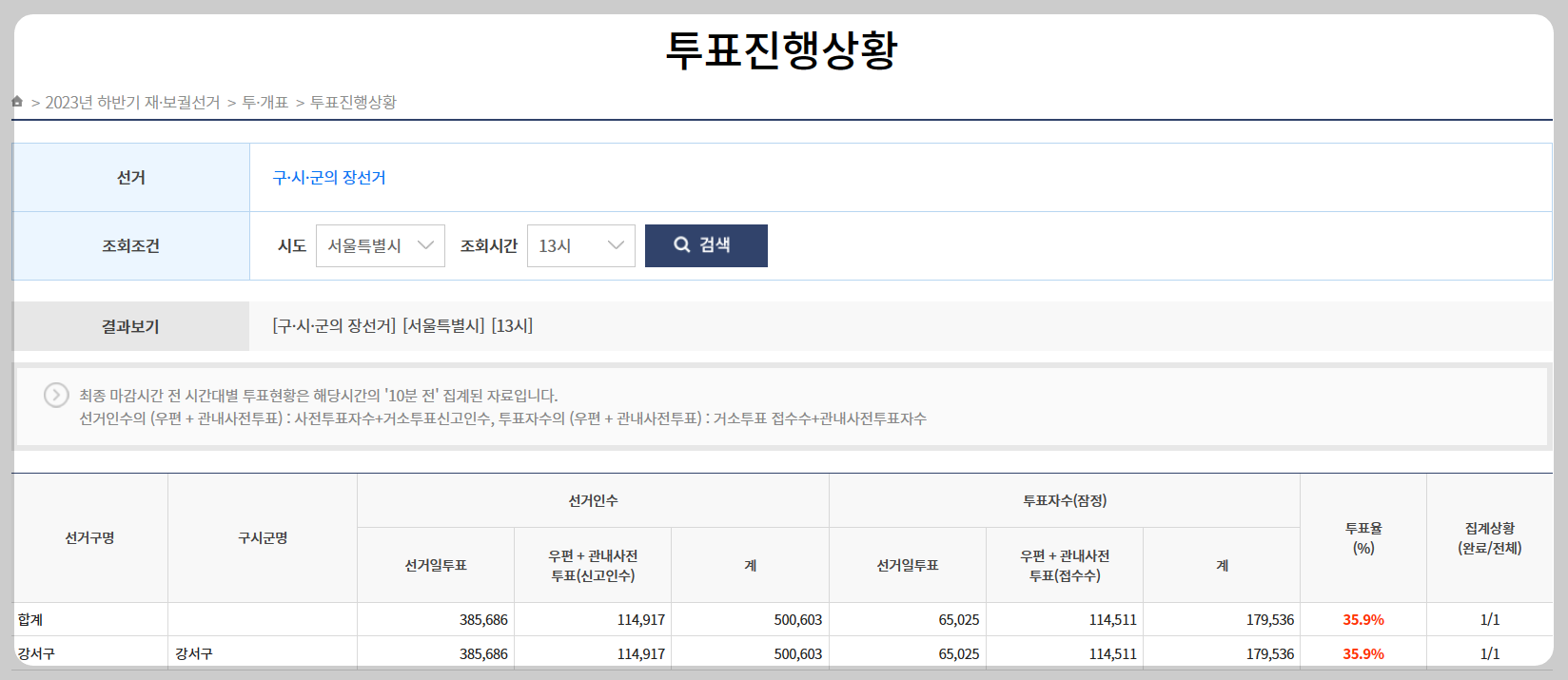 (13이후 강서구청장 투표율 확인하기)