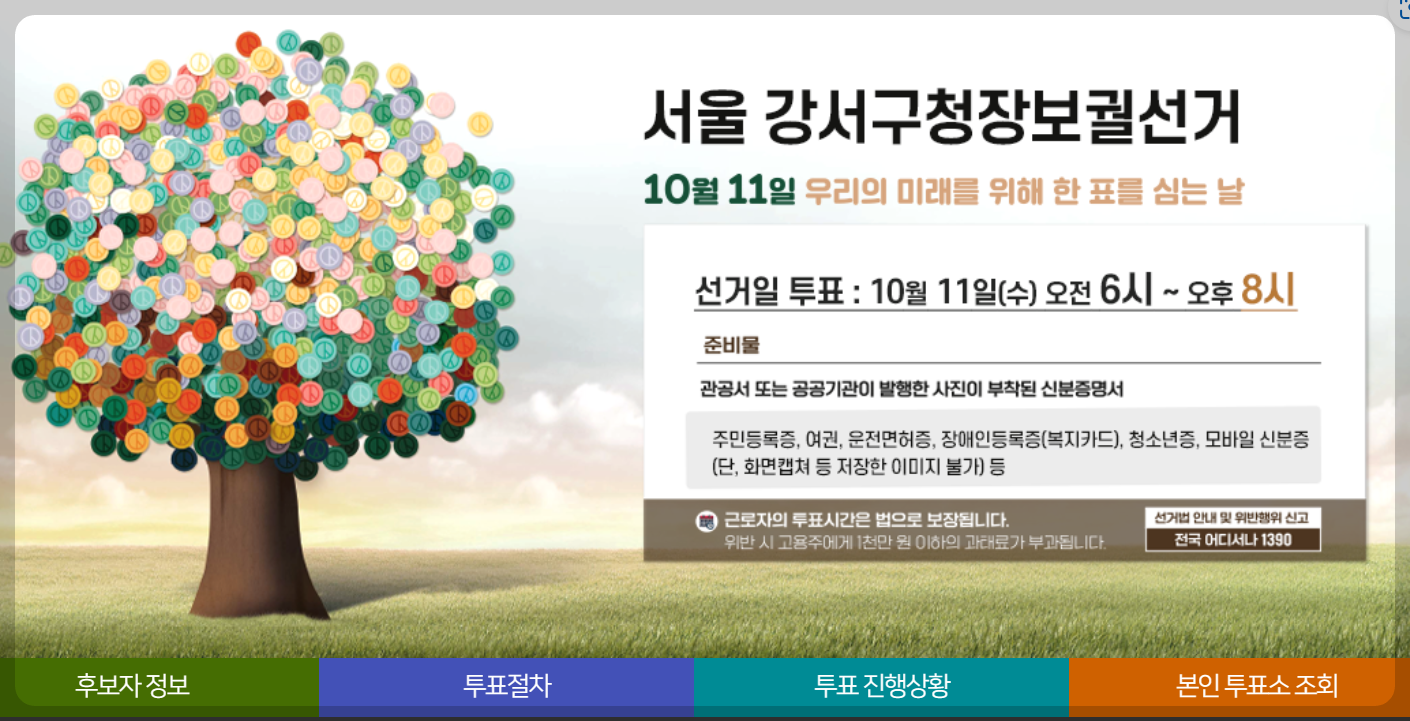 13시 이후 강서구청장 투표율이 궁금하신 분들은 아래 중앙 선거관리위원회 홈페이지 링크를 통해 확인하시길 바랍니다. 중앙선거관리위원회 홈페이지에서 투표율진행상황을 클릭하시고 구,시군 의장선거를 클릭하시면 이번 강서구청장 투표율 을 시간대별로 확인 할 수 있습니다.