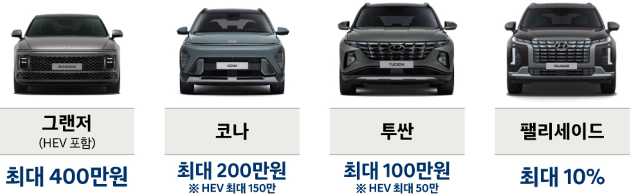 현대자동차가 전기차 구매 보조금 지원을 한시적으로 확대하는 정부 정책에 발맞춰 연말까지 ‘EV세일페스타’를 실시한다고 25일 밝혔다. 지난달부터 진행 중인 'EV 세일 페스타'의 제조사 할인 혜택과 코리아세일페스타 기간을 맞아 200만원 늘었났습니다. 이에 따라 아이오닉5 최대 600만원, 아이오닉6 최대 600만원, 코나EV 최대 400만원 할인됩니다.