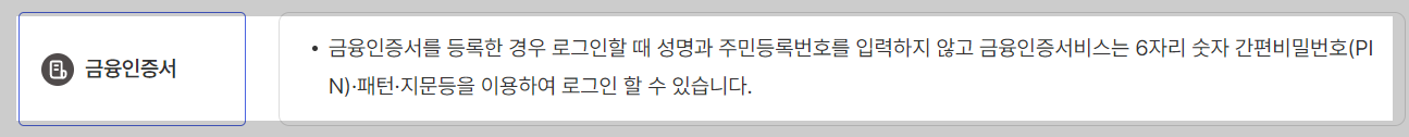 금융인증서를 등록한 경우 로그인할 때 성명과 주민등록번호를 입력하지 않고 금융인증서비스는 6자리 숫자 간편비밀번호(PIN)·패턴·지문등을 이용하여 로그인 할 수 있습니다.