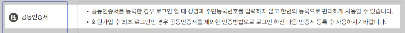 공동인증서를 등록한 경우 로그인 할 때 성명과 주민등록번호를 입력하지 않고 한번의 등록으로 편리하게 사용할 수 있습니다. 회원가입 후 최초 로그인인 경우 공동인증서를 제외한 인증방법으로 로그인 하신 다음 인증서 등록 후 사용하시기바랍니다.
