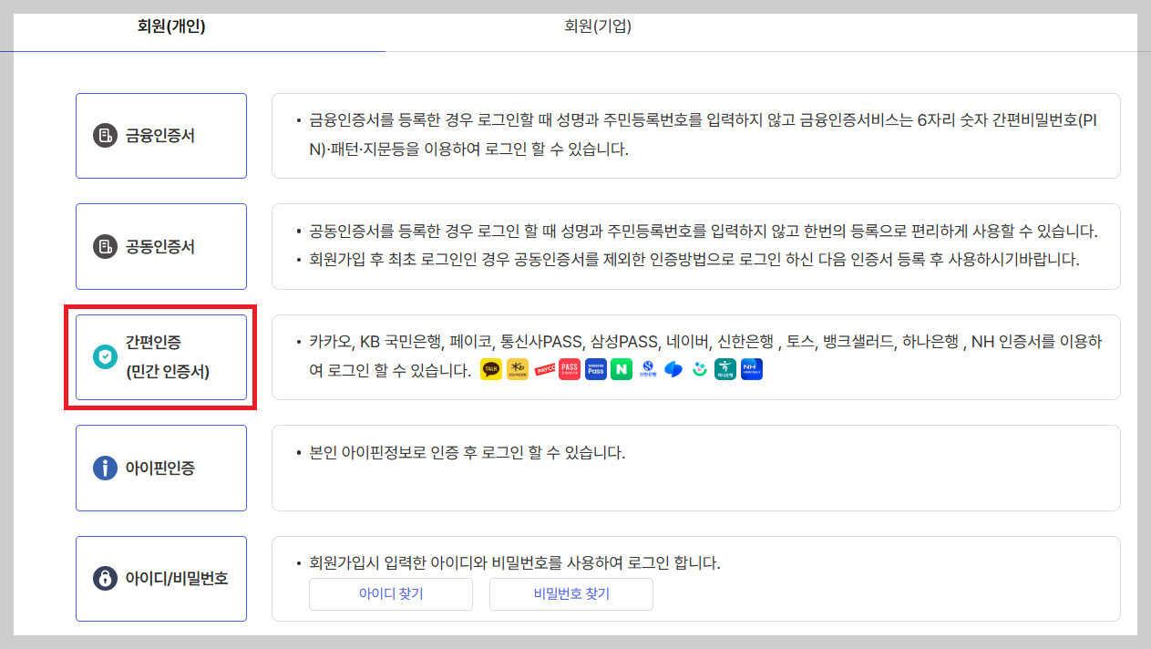 2. 로그인방식 5가지중 본인이 편한 로그인 선택.(예시)간편인증진행.)