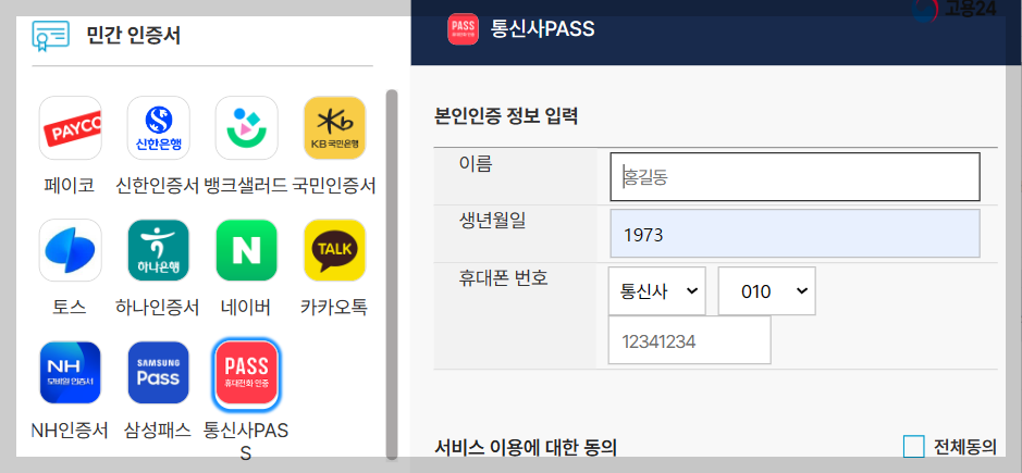 ▣ 고용24 로그인 진행 예시