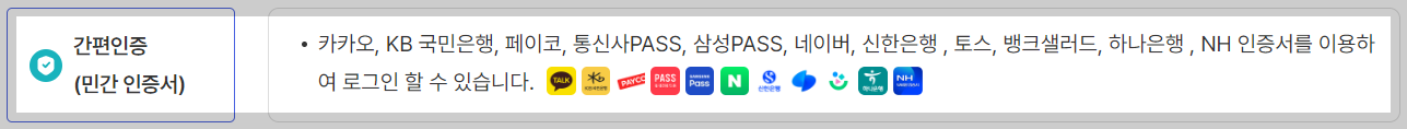 카카오, KB 국민은행, 페이코, 통신사PASS, 삼성PASS, 네이버, 신한은행 , 토스, 뱅크샐러드, 하나은행 , NH 인증서를 이용하여 로그인 할 수 있습니다.