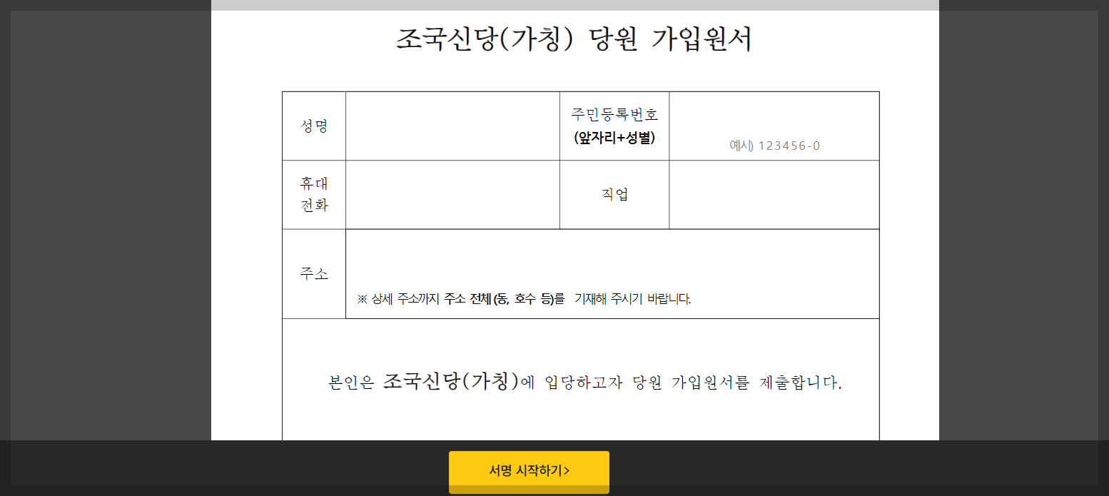4. 조국신당(가칭) 당원가입 원서 작성 서명시작하기 클릭