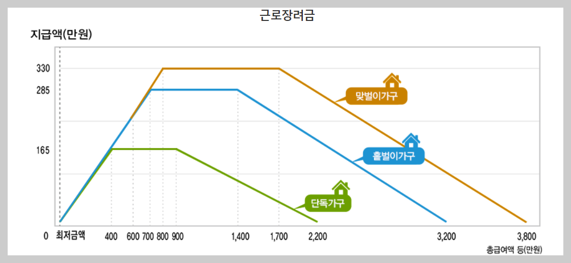 5월1일부터 2024 근로장려금 정기 신청기간입니다. 2024 근로장려금은 5월1알 수요일부터 5월31일까지 신청이 가능하며 기한후에도 신청이 가능하오니 아래 2024 근로장려금 신청자격을 확인하시고 신청자격이 된다면 꼭 신청하시기 바랍니다. 근로장려금은 근로자가 열심히 일은 하지만 소득이 적어 생활이 어려운 사업자(전문직제외) 또는 근로자 가구에 대해 가구원 구성과 총급여액 등에 따라 정부가 산정된 근로장려금을 지급함으로써 근로를 장려하고 실질소득을 지원하는 근로연계형 소득지원 제도입니다. 이번 2024 근로장려금 신청자격 중 맞벌이가구 소득이 4400만원까지 완화 변경되었으니 2024 근로장려금 신청자격을 꼭 확인하시고 진행하시기 바랍니다.
