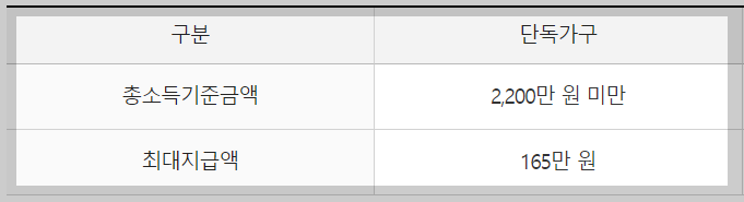 | 단독가구 | 배우자, 부양자녀, 70세 이상 직계존속이 없는 가구 | |