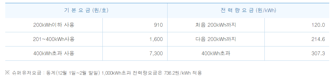 예를 들어, 기타계절에 월 300kWh를 사용한 가정은 처음 200kWh에 대해서는 kWh당 120.0원이 적용되고, 나머지100kWh에 대해서는 214.6원이 각각 적용돼 총 45,460원의 전력량요금이 부과됩니다.
