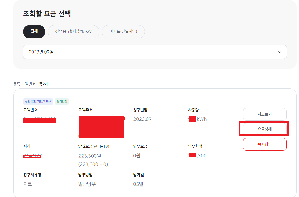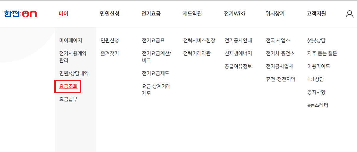 1. 한전On 접속하여 로그인한다. 요금조회를 클릭한다. 조회할 전기요금을 확인한다.