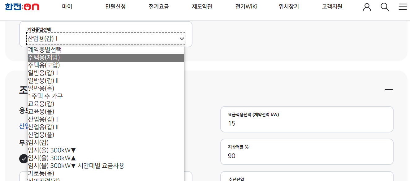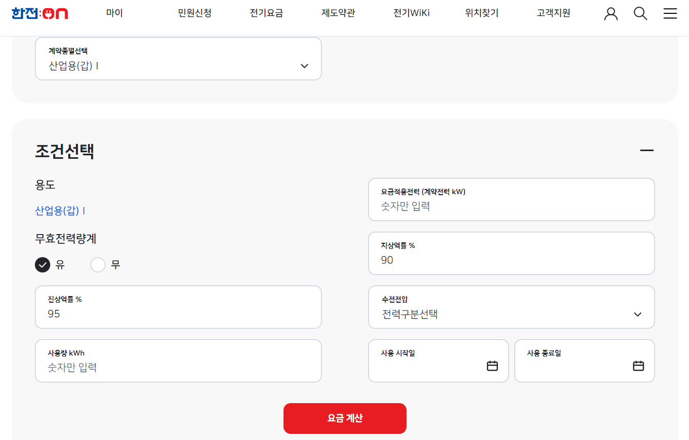 | 전기요금계산기 | 계약별종류선택 | 조건입력후 요금계산 |