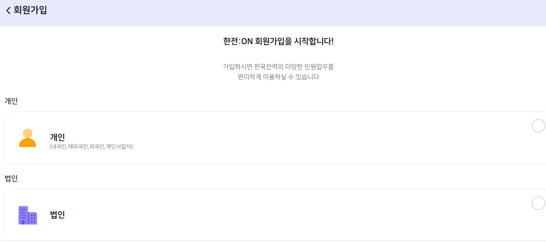 | 회원가입 로그인 | 개인또는 법인선택 | 가입대상 선택 | 회원 상세내용입력 |
