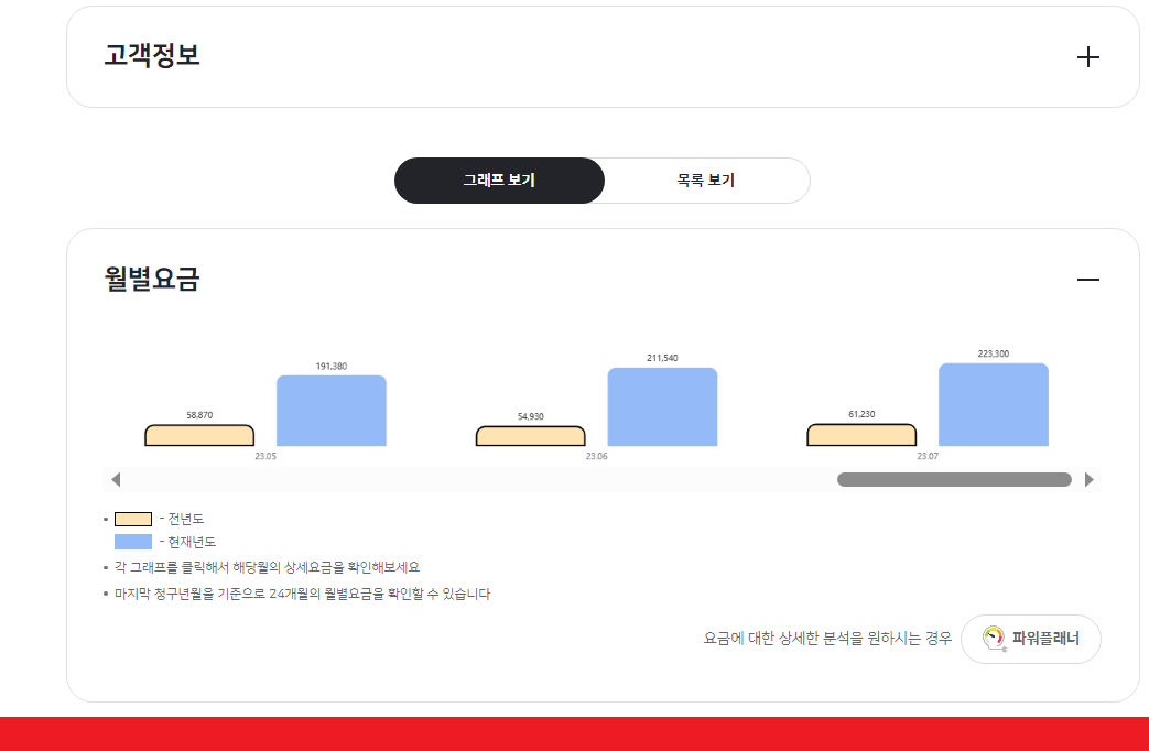 2. 요금상세 클릭 시 월별요금 및 작년도 청구내역을 확인할 수 있으며 상세내용도 확인할수 있습니다.