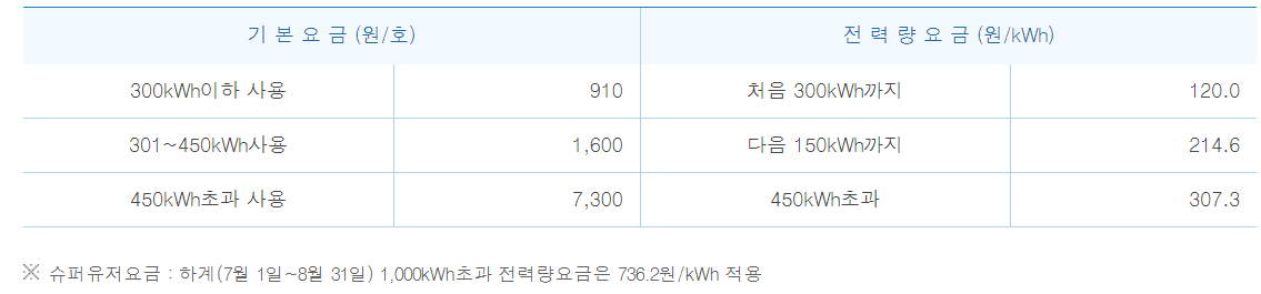 ○ 주택용전력(저압) 전기요금표 하계(7월 1일~8월 31일)